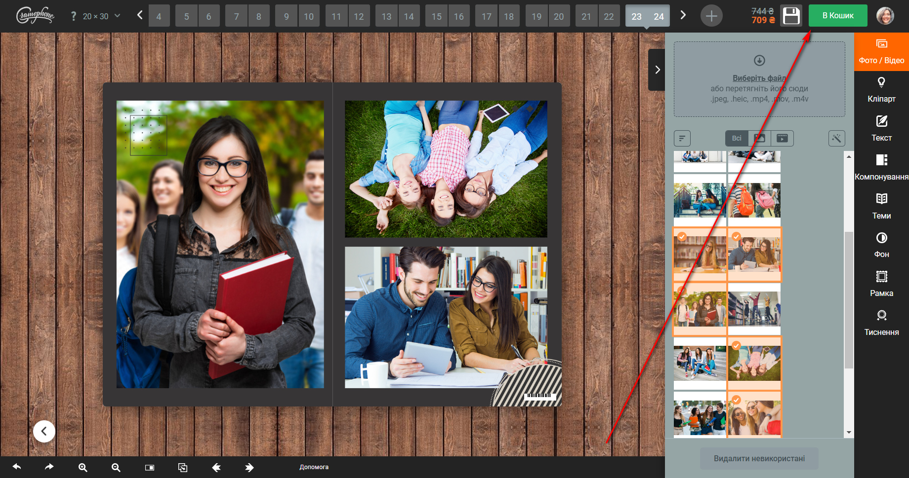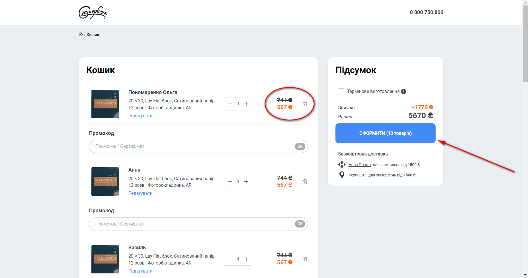 Повторіть всі попередні кроки поки не назбираєте в кошику всі потрібні альбоми. При оформленні від 10 фотокниг (не змінюючи параметрів!!!) в кошику буде автоматично порахована знижка 20% на весь тираж.
