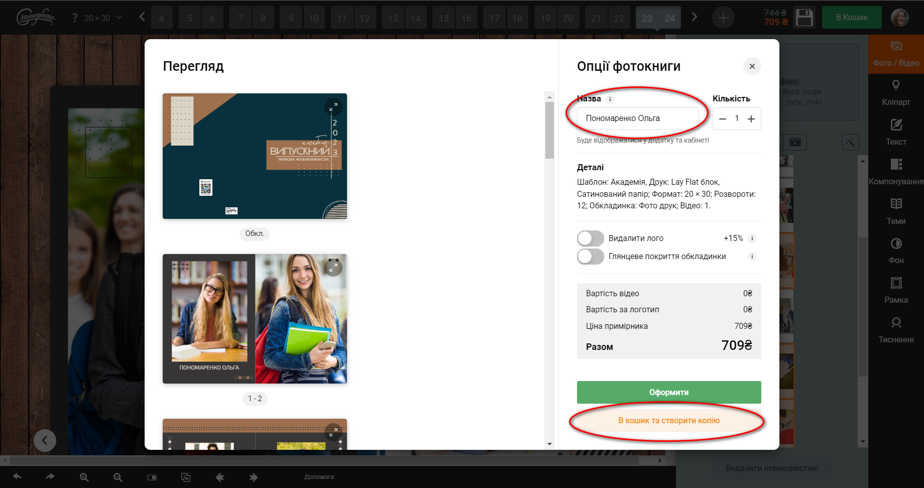 Перевірте готовий макет та всі підписи до фото. Все добре? Тоді тисніть кнопку «В Кошик». У віконці, що з'явиться, ще раз перегляньте макет, підпишіть альбом іменем учня для якого його створили та натисніть кнопку «В кошик та створити копію». Готовий макет потрапить до кошика, а ви лишитесь в редакторі з копією, яку потрібно відредагувати для іншого учня.