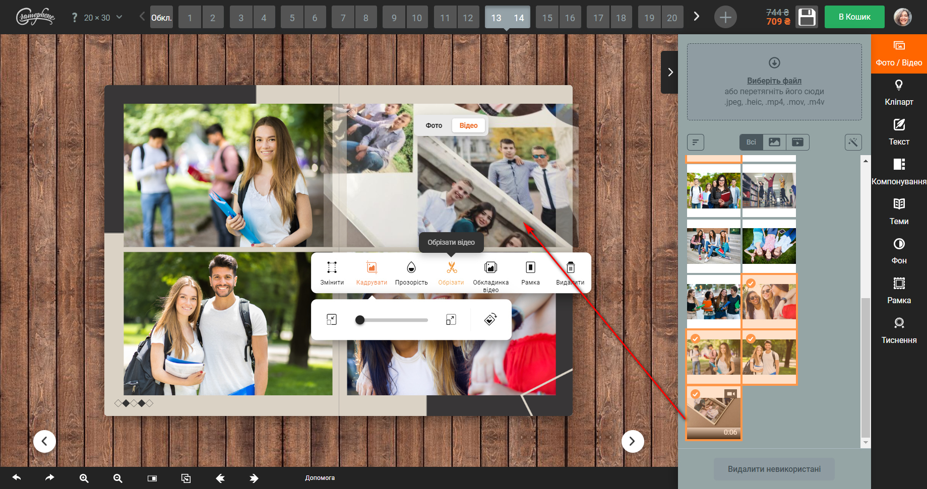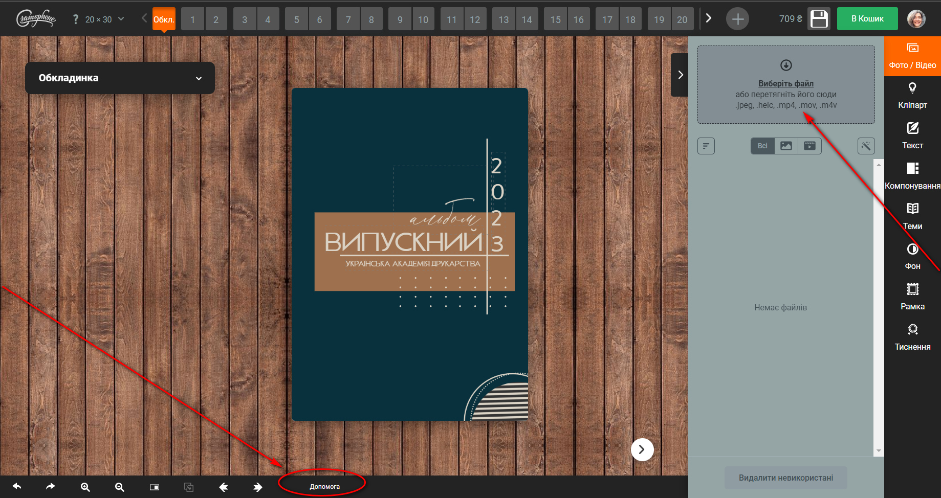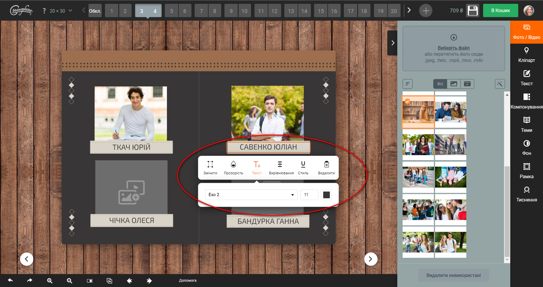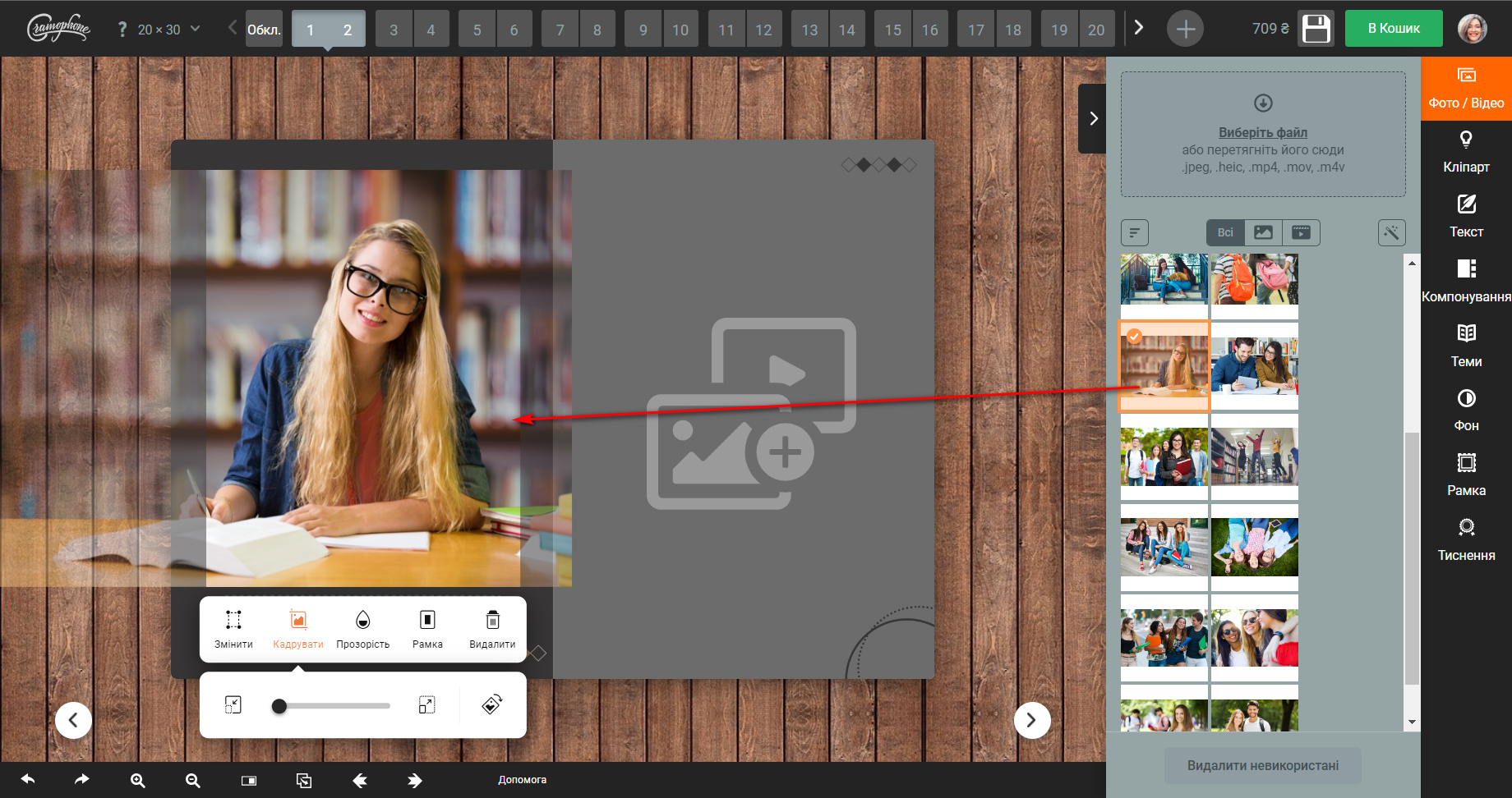 Далі переходите в редактор. Завантажуєте фото класу та першого учня. Можете просто додати фото в комірки та змінити підписи. А можете повністю змінювати дизайн, видаляти чи додавати об'єкти.Інструкція по роботі з редактором є тут та безпосередньо в редакторі.