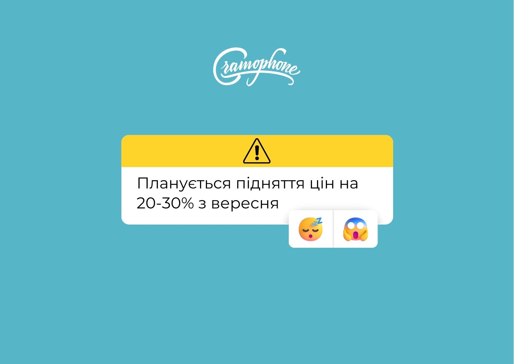 In connection with the situation in the country, we plan to raise the prices of all products by 20-30%. We hope for your understanding. Estimated price change date September 9. So you still have an opportunity to purchase all Gramofon.ua products at 2021 prices.