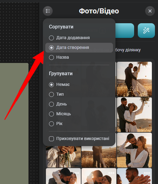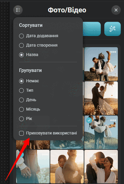 If the photos you have used already confuse you when creating a book, use the "Hide Used Photos" feature. To do this, simply check the box next to this option in the drop-down box