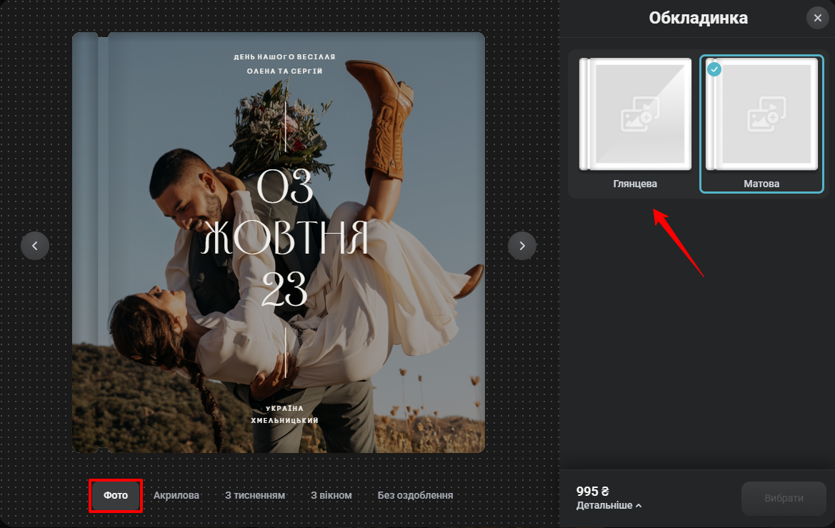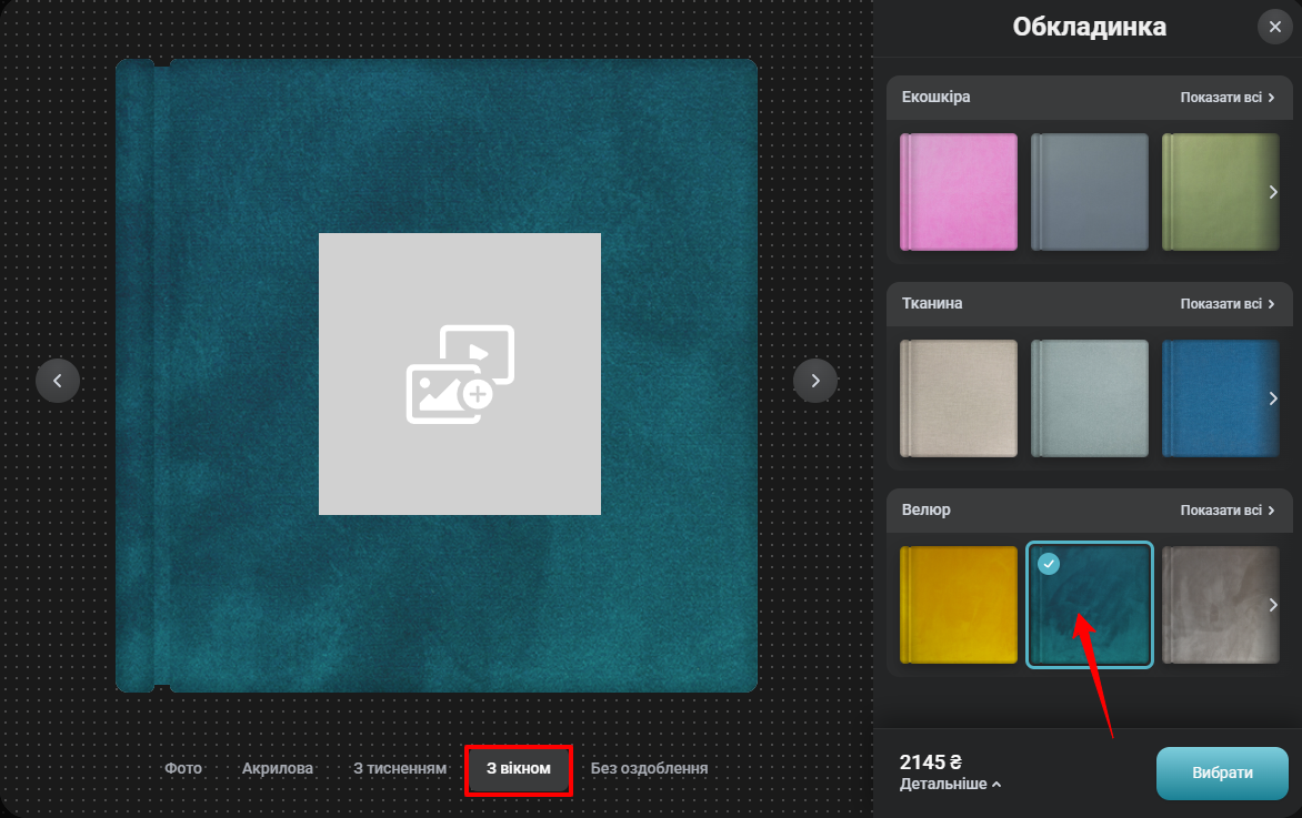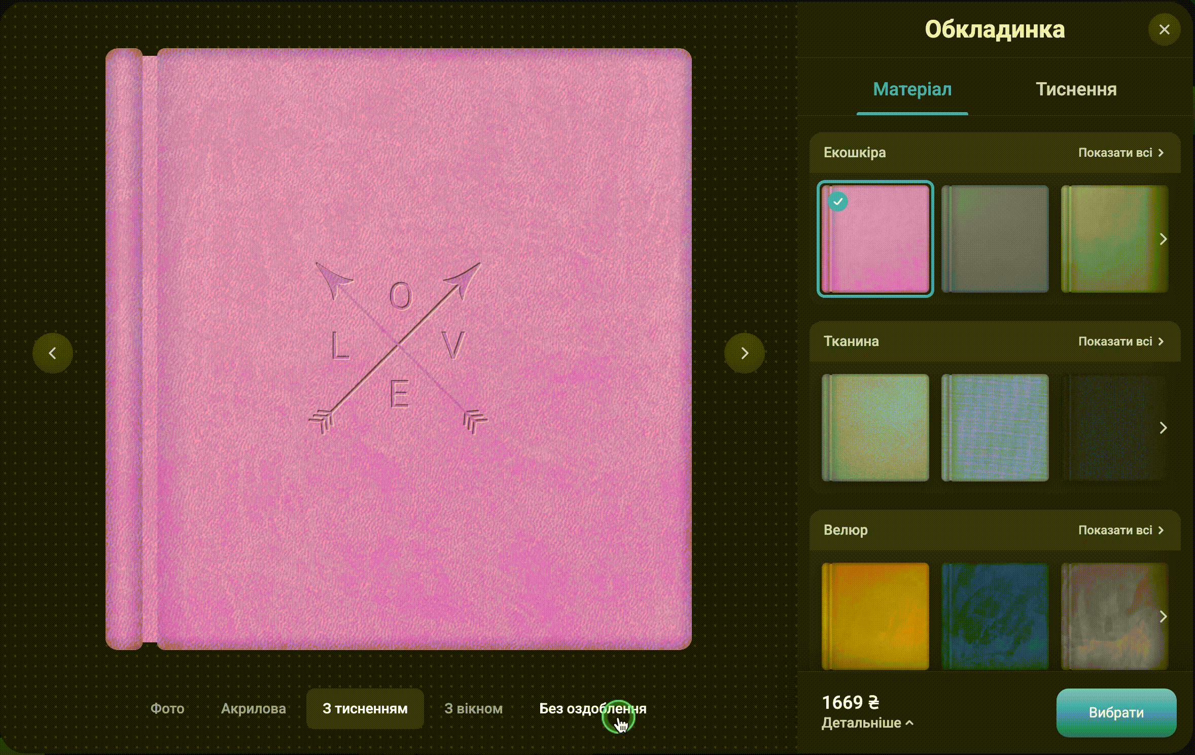 In order to change the type of the cover, click on the desired type of cover (photo cover, faux leather or textile) in the upper left part of the editor. After that, you can choose the type of decoration and color of the material (for faux leather or textile).