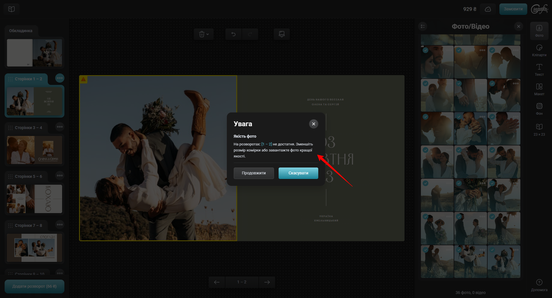 If you disregarded this prompt when you placed the photo on the page/cover of the book, the system will inform you again about the small file extension in a pop-up window when you click Add to Cart.