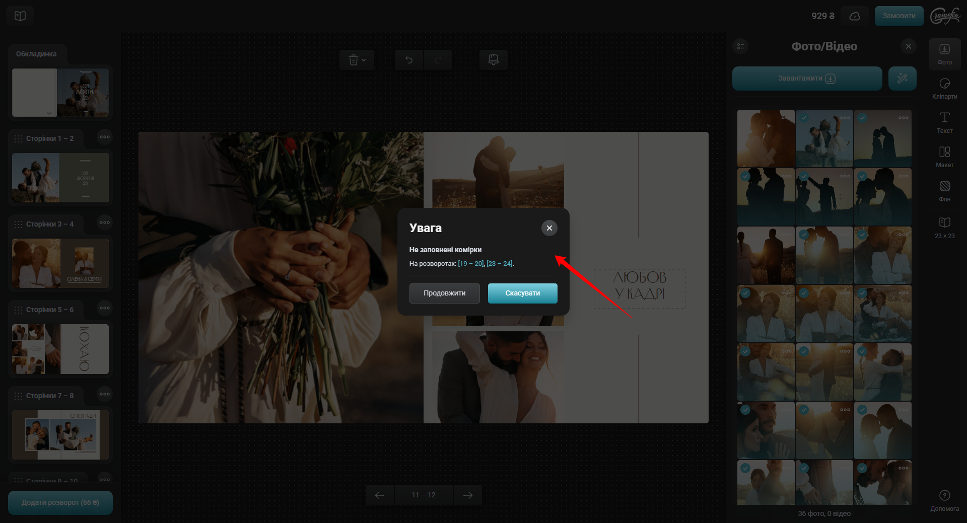 If in the preview mode, when you click Add to Cart, you see that all pages are filled and there are no empty spaces, then most likely you have placed a photo on top of the photo cell. You can ignore the system prompt and proceed with the ordering process.