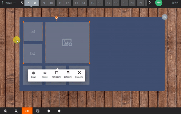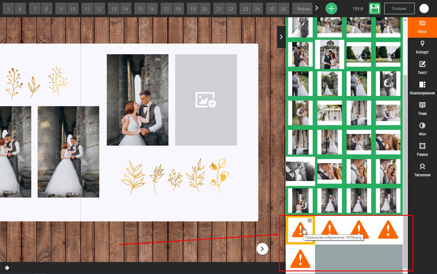 Note: you can place the frame only on the photo or layout (empty cells under the photo), if you move the frame to an empty page of the photo book or to cliparts, the frame will not move.